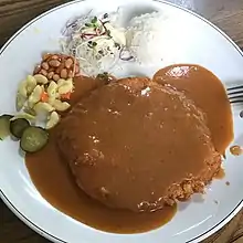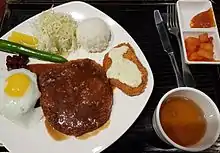 Korean don-gaseu is different from Japanese tonkatsu in that it is thinner and often served unsliced, thus eaten with a knife and fork, not chopsticks, and is served with demi-glace on top of the fried meat (or in case of fish cutlet, tartar sauce on the fried fish).[2] Common accompaniments include shredded cabbage sprinkled with ketchup-mayonnaise mixture, baked beans, macaroni salad, sweet corn, and danmuji (yellow pickled radish). Green chili peppers and doenjang (soybean paste) or ssamjang (wrap sauce) for dipping the chili peppers, baechu-kimchi (cabbage kimchi) or kkakdugi (radish kimchi), and rice with Korean or Japanese style soup can be served with the don-gaseu plate.[3] Alternatively, bread can replace rice, in which case Western-style soup is served before the main plate as an appetizer.[2]