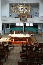 The church (also referred to as the Vermaning) was built in 1683.[1] The original entrance was a simple narrow door in the alley connecting the shopping street Grote Houtstraat to the Frankestraat, called the Peuzelaarsteeg, and through the purchase of a house in the Frankestraat a new, larger, entrance was created in 1717. In 1757 a group of members of the church, including Pieter Teyler van der Hulst, purchased a house on the Grote Houtstraat and created a modern but unobtrusive entrance with long hallway. In 1902 the Frankestraat entrance was renovated and new regents’ rooms were created in Jugendstil. During the course of centuries, almost the entire block of houses was purchased by the church, and a large house across from the church in the Frankestraat, the "Huis ter Kleef", was used as an orphanage.[2] The house on the corner of the Peuzelaarsteeg and the Grote Houtstraat (nr. 51) also was purchased by Pieter Teyler, and he rented it to the Dutch Society of Science for their museum, which was the first museum in Haarlem that opened its doors in 1777.