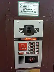 A door phone in its most basic version is a two-way intercom allowing communication from the street to the inside of a building. More complex door phones are connected to electric strikes, and can unlock and open the door to allow access to the interior of the building.[1]