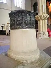 Other fittings include one of the few surviving lead fonts in England, frescoes of 1340 and several monuments, especially the well-known "swaggering knight" effigy formerly believed to be Sir John Holcombe who died in 1270 but it is more likely that it is William de Valence the Younger (died 1282 [2] at the Battle of Llandeilo Fawr), son of William de Valence, 1st Earl of Pembroke.