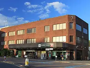 Dorking railway station is a railway station in Dorking, Surrey, England. Located on the Mole Valley line, it is 22 miles 8 chains (35.6 km) down the line from London Waterloo (via Wimbledon).[1] The station is one of three that serve the town of Dorking, alongside Dorking Deepdene and Dorking West stations (both on the North Downs Line). Dorking and Dorking Deepdene stations are within walking distance of each other[2] and interchange between them on a through ticket is permitted.