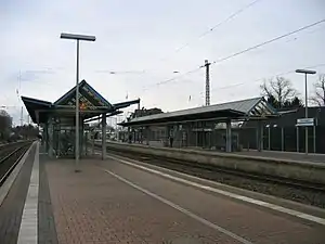Dormagen station is a station in the city of Dormagen in the German state of North Rhine-Westphalia, on the Sülz Valley Railway. It is served by the Rhein-Münsterland-Express (RE 7), operated hourly, and S-Bahn line S 11, operated at 20-minute intervals. It has four platform tracks.[6][7]