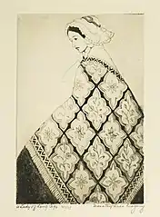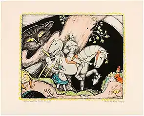 Gregory married fellow student,Ross Moffett, in 1920 and the couple made their home in Provincetown.[13] That year, she had her first piece accepted by the jury of the Provincetown Art Association for one of its annual summer exhibitions.[20] The jurors were Max Bohm, Charles Webster Hawthorne, E. Ambrose Webster, Oliver Chaffee, George Elmer Browne, Ethel Mars, and Mrs. Henry Mottet (Jeanie Gallup Mottet). Her submission was an untitled drawing.[21] She continued to have works accepted for almost every one of these exhibitions from the 1920s through the 1960s.[20] In 1927, a petition from Moffett resulted in the staging of a second show each year, this one styled the exhibition of "moderns".[22] Between 1930 and 1937, when the association stopped giving separate modern and traditional exhibitions, Gregory contributed mainly to the moderns.[23] In the 1920s and 1930s, Gregory usually showed drawings and prints.[20] In 1929, she showed an etching called "Bonnet and Shawl".[24] Another etching, "A Lady of Long Ago", shown above, Image No. 2, was in the same series. She began making lithographs in 1932 when her brother, John, set up a lithographic studio in Provincetown.[25] The studio presented demonstrations, gave instruction, and provided a print workshop for artists.[26] A few years later, she began what would become her best-known prints, a series of lithographs taken from Alice's Adventures in Wonderland and Through the Looking Glass.[20] In 1972, she said these prints remained popular for the rest of her career.[3] In the Provincetown Artists Association of 1937, she exhibited "Alice and the White Knight", shown above, Image No. 3.[27]