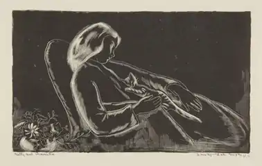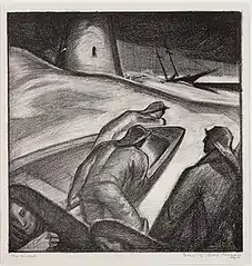 In 1929, Gregory was given a solo exhibition of etchings at Macy's flagship department store on Herald Square in Manhattan.[28] In reviewing the show, a critic for the Cincinnati Enquirer called the prints "beguiling".[29] A few years later, she showed drawings and etchings in a duo show with her brother John at the Boston Art Club.[30] Three years later, when she showed with him again, this time at the John Warwick Galleries in Philadelphia, a critic for The Philadelphia Inquirer praised a lithograph of hers called "The Wreck" (shown above, Image No. 4).[31] When he reviewed the Provincetown Annual of that summer, Edward Alden Jewell of The New York Times said "The Wreck" had "special merit".[32] In 1939, the Art Institute of Chicago showed her lithograph, "Betty and Araminta" in its seventh annual international exhibition of lithography and wood engraving (shown above, Image No. 5).[33] Gregory's granddaughter later said that this print shows her mother (Gregory's daughter, Elizabeth) holding one of the family's cats.[34] In reviewing the show, a critic for The Philadelphia Inquirer said the print showed a "strong sense of design".[31]