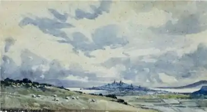 Her untitled watercolor landscape, shown above, Image No. 7, gives a sense of her early style. Her oil painting, "Summer on Cape Cod" of 1950, shown above, Image No. 8, gives a sense of her late landscape style in that medium. "The Birds", shown above, Image No. 9, gives a sense of her handling of abstraction in oil. A representative etching is "A Lady of Long Ago", shown above, Image No. 2.[23] "The Wreck", shown above, Image No. 4, is an example of her early lithography. "Alice and the White Knight", shown above, Image No. 3, is one of her best-known lithographs.[34] In 1956 a reviewer noted that her late-career paintings had subjects that varied "from the humorous 'Breezy Sunday' through the quiet 'Night for Dreaming' to the dramatic 'Eye of the Hurricane'".[38]