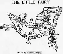 In 1972, Gregory recalled that while in school she was constantly making drawings.[3] After her mother died when she was thirteen, she and her younger brother were raised by their father, Grant Gregory, who encouraged her interest in art.[4] She also received encouragement from his sister, Helen Gregory, who had studied with Whistler.[5] While a student at Public School 112 in Brooklyn, she made drawings for a section of the Brooklyn Daily Eagle called "For Young Readers".[6] At the age of fourteen in 1908, Gregory made a drawing called "The Little Fairy" which shows her youthful style and contains surprising humor with its cobweb clock face with hands pointing to noon and its "Quick Lunch" sign suggesting that two spiders are going to join the pictured fairy in eating their lunch.[2] This drawing is shown above, Image No 1.
