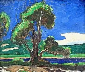 On leaving Pratt, Gregory began to study at the Art Students League where her instructors included the realist painter, Robert Henri.[3] In 1916, the League awarded her a cash prize in an exhibition of works by students in its Landscape School.[16] She participated in another League exhibition at the conclusion of its summer session at Woodstock, New York. One of her paintings in this show drew praise from a critic in the Brooklyn Daily Eagle who wrote that she struck "a note of summer in a low-horizoned canvas, with deep-toned hills, and a single artistically-built tree, prominent in the middle distance, which merges into the green foreground."[17] Encouraged by a fellow student to spend a summer in Provincetown, Massachusetts at the Cape Cod School of Art, she enrolled but left early, feeling disappointed with the quality of instruction and behavior of Charles Webster Hawthorne, its director. She wrote her father at the time, saying "Mr. Hawthorne is the worst teacher I have ever seen... He uses fearfully bad grammar and is a flirt, and doesn't give a rap for his students."[18]