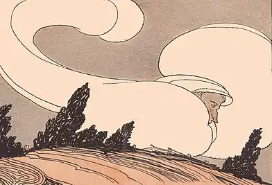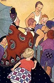 Gregory began her career as an illustrator in 1921 when she produced colored plates for a book of poems called Happy Hour Stories (compiled by Genevieve Silvester and Edith Marshall Peter, American Book Co., Cincinnati).[45] Included in the collection was Robert Louis Stevenson's "The Wind", in which the poet asks, "O blower, are you young or old/Are you beast of field and tree,/Or just a stronger child than me?" Gregory's illustration of the poem shows a human figure swirling down from the sky. This illustration is shown above, Image No. 10. In 1924, she made the illustrations for the first edition of The Box-Car Children by Gertrude Chandler Warner (Rand McNally & Company, Chicago).[46][note 1] Shown above, Image No. 11 is the illustration "Henry felt himself lifted on many shoulders" from a chapter of this book called "The Race".