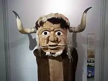 A wooden head, the Dorset Ooser had been cut from a single block of timber, with the exception of the lower jaw, which was movable and connected to the rest of the mask by leather hinges.[1] The lower jaw could be moved by pulling on a string which passed through a hole in the upper jaw to connect to the lower.[1] The mask also contained locks of hair on either side of its head, a beard on its chin, and a pair of bullock's horns.[1] Between the Ooser's eyes was a rounded boss, the meaning of which is unknown.[2] The Ooser was hollow, allowing someone to place their own head within it, potentially permitting it to be worn as a mask whilst being supported on the shoulders; however, there were no holes allowing for the wearer to see while wearing it in this way.[1] The historian Ronald Hutton described the Ooser as "a terrifying horned mask with human face, staring eyes, beard, and gnashing teeth".[3] Similarly, the folklorist H. S. L. Dewar stated that "the expression of the eyes [conveyed] a really agonized spirit of hatred, terror, and despair".[2]