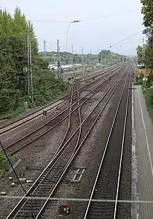 Buschstraße junction was re-established with the conversion of the line from Dortmund-Huckarde to Dortmund-Mengede for the S-Bahn in 1986.[12] However, only one set of points was re-established, so trains from Deusen must run from the junction to Huckarde Süd Railway Station on the left track, opposite the normal direction of travel. Shortly after the junction the line becomes two-track and the rest of the line is duplicated.