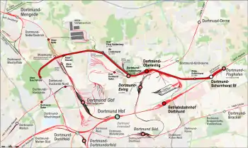 At Deusen junction it also formerly connected with the link to the former Dortmund freight yard (Dortmunder Güterbahnhof), which was located just north and parallel with the Duisburg–Dortmund railway and has been disused since 30 June 2004.[3][4] As described in the following section, it next connects at Buschstraße junction with the former Emscher Valley Railway of the Royal Westphalian Railway Company from Dortmund Bodelschwingh to Dortmund-Huckarde Süd, now used by line S2 of the Rhine-Ruhr S-Bahn.[5]