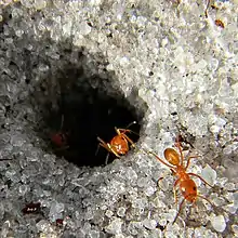 Dorymyrmex bureni, also known as the pyramid ant, is a species of ant in the genus Dorymyrmex. Described by Trager in 1988, the species is endemic to the United States and Mexico.[1] Pyramid ants are medium-sized ants, ranging from 2โ4 mm. They are light orange in color and fast moving. Unlike other ants in the area like red imported fire ants (Solenopsis invicta), this species is not aggressive towards humans. The workers have a foul smelling coconut odor when crushed. Dorymyrmex bureni hunt living insects, even other winged ants. They also search for sap-sucking insects from which they collect honeydew. On the head of these ants are curved hairs, used for transporting beads of damp sand. Colonies are small. Nests usually have a single entrance with a mound of sand shaped like a crater. Dorymyrmex bureni prefer sandy soil. This species of ant is not an indoor pest, and pesticides should not be used. They are found throughout Florida.[2]