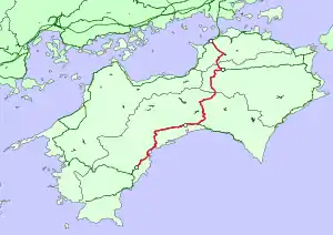 Dosan Line (土讃線, Dosan-sen) is a railway line in Shikoku, Japan, operated by the Shikoku Railway Company (JR Shikoku). It connects Tadotsu Station in Tadotsu, Kagawa, and Kubokawa Station in Shimanto, Kōchi. The line links the city of Kōchi with northern Shikoku and the island of Honshū via the Seto-Ōhashi Line. The first section of the line between Tadotsu and Kotohira opened in 1889, Kochi was connected to the northern section of the line in 1935, and the western extension of the line was completed in 1951. The name of the line comes from "Tosa" () and "Sanuki" (), the old provincial names of present-day Kōchi Prefecture and Kagawa Prefecture, respectively.