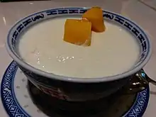 Double skin milk (Chinese: 雙皮奶; Jyutping: soeng1 pei4 naai5) is a Chinese dessert made of milk, egg whites, and sugar. It originated from Shunde, Guangdong.[1] It is a velvety smooth milk custard somewhat resembling panna cotta, with two skins. The first skin is formed during cooling of the boiled milk and the second when cooling the cooked custard. Traditionally, buffalo milk is used; its higher fat content compared to cow's milk produces a smooth texture. The usage of milk from the swamp buffalo in China is unusual because of the low yield of milk as compared with that of cows and river buffalo used in the rest of the world.[2] This dessert is particularly popular in Shunde, Guangzhou, Shenzhen, Macau, and Hong Kong.