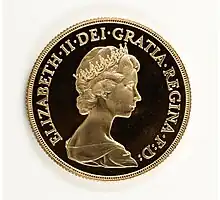 The reign of Queen Elizabeth II (r. 1952–2022) saw a departure from the normal practice in issuing gold coinage. A small number of gold £2 pieces, with an obverse by Mary Gillick, were struck in 1953 in order to provide continuity of the series, but the coins were not released to the public, and were placed only in museums and in the Royal Collection.[33] No further £2 gold pieces were struck until 1980.[32] The 1953 strikings bore an obverse legend of ELIZABETH II DEI GRA BRITT OMN REGINA F D (Elizabeth II by the grace of God queen of all the Britains, defender of the faith) but this was changed after 1953, removing BRITT OMN (of all the Britains) and modifying the abbreviations.[32] The omission was made to acknowledge the evolving British Commonwealth, which by then contained some republics.[34]