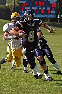 ![]() Doug Goldsby playing as quarterback for the UBC Thunderbirds against the Alberta Golden Bears on September 15, 2007. Wilson Wong photo. | |