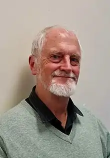 ![]() Dougal Dixon in 2009 with a model of a "Strida", one of the creatures featured in his 2010 book Greenworld | |