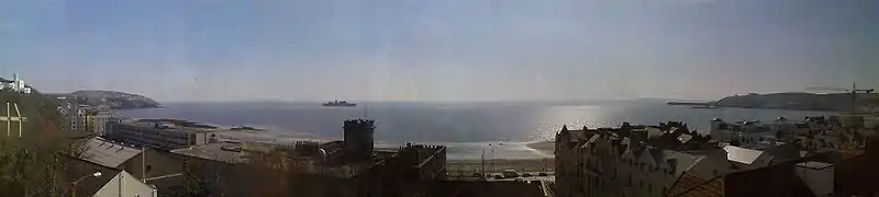 Douglas (Manx: Doolish, pronounced [ˈdðuːlʲəʃ]) is the capital city and largest settlement of the Isle of Man,[1] with a population of 26,677 (2021). It is located at the mouth of the River Douglas, and on a sweeping bay of two miles (three kilometres). The River Douglas forms part of the city's harbour and main commercial port.