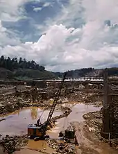 In spite of a four-week work delay caused by flooding, the Douglas Dam was completed and its floodgates were closed on February 19, 1943, 382 days after the construction began; this set a world record for a project of its size.[2][3] Its first electric generator went on-line on March 21, 1943, and its second one went on-line on January 1, 1944. Its powerhouse operated at maximum capacity for most of its first year of operation.[2] After its completion, the Douglas Dam powerhouse furnished electric power for two critical war industries, aluminum production and the Manhattan Project's uranium enrichment operations at nearby Oak Ridge, Tennessee.[3]