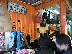 The lane is named after Hong Kong Tai-pan Douglas Lapraik whose dockyard and subsequent Douglas Steamship Company wharf was once located in the area now reclaimed and the site of Exchange Square.[2][3][4] The lane has also been adapted to serve as an outdoor bazaar. Douglas Lane has been dubbed as a Hawker Blackspot for Central and Western District meaning that the Food and Environmental Hygiene Department would give no warning to hawkers at the location before taking prosecution actions against them if they are caught.[5]