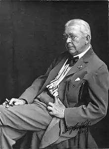 He was one of eight American artists commissioned by the National Art Committee to depict major figures from the Great War (World War I).[9] His three portraits – King Albert I of Belgium (1919), standing in uniform on a battlefield; British Prime Minister David Lloyd George (1919–20), seated at his desk; General John J. Pershing (1920–21), standing in uniform with his horse's reins in his hand – were donated to the National Portrait Gallery. The first two were later transferred to the Smithsonian American Art Museum. An abandoned version of Volk's Pershing portrait showed the general standing beside the grave of an unknown soldier.[10]
