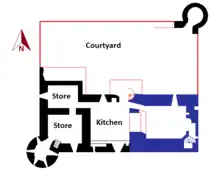 During the extension works the existing entrance was bricked up and a new entrance provided in the north wall of the extension.[3] The castle's original kitchen, situated in the western portion of the ground floor, was replaced by a larger facility in the eastern portion of the extension.[7] The original tower's hall is also likely to have been replaced by a larger room on the first floor of the extension, to which the old hall acted as an antechamber. The stairs in the extension's south-west tower became the principal means of access, replacing the staircase in the south-east of the original tower house.[8] The extension probably rose to four storeys but only the lower two survive.[3]