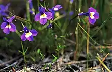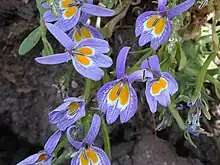 Downingia is a genus of 13 annual plants native to western North America and Chile. Commonly known as calico flowers, they are notable for forming mass displays of small but colorful blooms around vernal pools. A number are uncommon endemics in California.