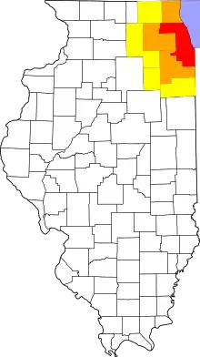 Downstate Illinois lacks a precise definition. Various boundaries that have been used are the Chicago city limits, the boundaries of Cook County, the collar counties, all of Illinois not contained in the Chicago media market, Interstate 80, and Bloomington.[5] Prior to the 2000 United States census, when it became part of the Chicago metropolitan area, even DeKalb (located 65 miles west of Chicago) was often considered to be "downstate".[6][7][8]