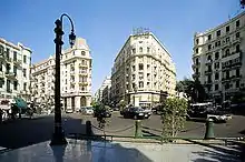 One of Wust al-Balad's main streets, lined with vintage architecture from the late 19th and early 20th century European Beaux-Arts and Egyptian—Islamic—Moorish Revival styles.