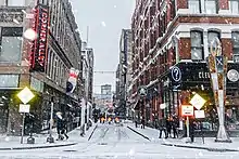 Short Vincent, located between East 6th and East 9th Street, is short street that once served as one of Cleveland's major entertainment districts and a center for the city's nightlife.[50][51] Densely packed with restaurants, dive bars, jazz clubs, and bounded by the risqué Roxy Burlesque Theater and the art deco Bond Clothing Store, the district first emerged in the late 1920s and reached its height in the 1940s and 1950s.[52]