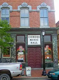 - Cohoes Music Hall, 58 Remsen Street. The one outstanding Second Empire building in the district, dating to 1874 and listed on the National Register in its own right in 1971. Four-story brick building with mansard roof, hood moldings, stone courses and marble storefront is one of the most ornate and best-preserved commercial facades in the district.[1]