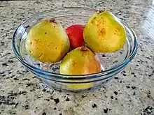 The Comice pear is large and greenish-yellow, with a red blush and some russeting. Its flesh is pale, melting, and very juicy.[3] Because the skin is very delicate and easily bruised, it requires special handling and is not well suited to mechanical packing.[4]