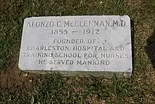 Alonzo Clifton McClennan (May 1, 1855 - April 14, 1912) was an African-American medical doctor who was the co-founder of the Charleston Hospital and Training School for Nurses in Charleston, South Carolina, established to provide for the education of black nurses, care of black patients, and hospital privileges for black doctors. It opened in 1897.[1][2] McClennan had gone to medical school after being the second African American appointed as a midshipman to United States Naval Academy. He resigned in order to go directly into medicine.[3] Graduating with medical and pharmacy degrees, he married and settled in Charleston, South Carolina, where he set up his medical practice.