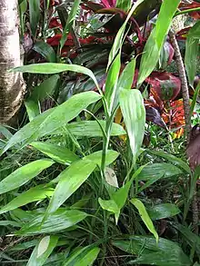 A perennial herb reaching a height of 100 cm (39 in), the plant has slightly twisted leaves of grey-green colour, with a length of which is up to 23 cm (9 in). The stem is fleshy, which distinguishes it from bamboo. It requires bright, ventilated areas. It tolerates dry air and does not require constant spraying. A very tenacious plant, it is rather difficult to destroy.