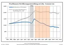 Development of Population since 1875 within the Current Boundaries (Blue Line: Population; Dotted Line: Comparison to Population Development of Brandenburg state; Grey Background: Time of Nazi rule; Red Background: Time of Communist rule)
