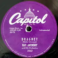 "Dragnet" is an instrumental theme from the radio and television show of the same name. It was composed by Walter Schumann for the radio show, and was also used on the subsequent television series and later syndication of the TV series under the name "Badge 714". The theme is in two parts: an opening signature "Main Title" ("Dum - - - de - DUM - DUM") and the "Dragnet March" used over the end credits.