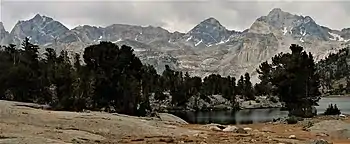 Dragon Peak is a 12,955-foot-elevation (3,949 meter) mountain summit located on the crest of the Sierra Nevada mountain range in northern California.[6] It is situated on the common border of Fresno County with Inyo County, as well as the boundary shared by John Muir Wilderness and Kings Canyon National Park. It is 10 miles (16 km) west of the community of Independence, and 1.3 miles (2.1 km) south of Black Mountain. Dragon Peak ranks as the 161st-highest summit in California.[4] Topographic relief is significant as the north aspect rises 1,900 feet (580 meters) above Dragon Lake in less than one mile. This mountain is habitat for the endangered Sierra Nevada bighorn sheep, which restricts climbing from July through December, so most ascents are made in the spring. The first ascent of the summit was made in 1920 by either Norman Clyde, or Fred Parker and J. E. Rother.[8] The John Muir Trail traverses two miles west of this peak, providing an approach option. The mountain is so named because of the shape of its outline as seen from Rae Lakes.[9]