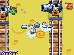 Another primary game mechanic is the tank battles. Tank battles either occur in the stages or at the tank battle arena in Boingburg. In stages, when the player encounters a platform with an enemy on it standing in front of a slime-shaped tank, they may summon their tank to do battle with them.[4] When the player goes into the battle, the top screen displays a zoomed out view of the two tanks on either side of the screen, and the bottom screen displays the standard gameplay.[4] Each tank has two cannons that ammunition may be loaded into, and an HP meter, the latter which varies from tank to tank.[4] Ammunition comes from varying points in the tank; the location of these drop points varies depending on which tank is being used.[4] The player picks up ammunition using the Elasto Blast, like they pick up items in the other mode of play. They then may throw the ammunition into one or both of the cannons, causing the ammunition to be fired at the opposing tank. The opponent, however, will also fire ammunition at the player's tank. If two pieces of ammunition collide with each other, both pieces will fall to the ground, though some pieces of ammunition have more defensive and/or offensive power than others.[4]