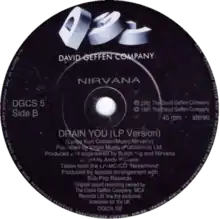 According to a February 1997 Goldmine article by American journalist Gillian G. Gaar, "Drain You" was originally planned as the second single from Nevermind.[15] A promotional single was released in late 1991, but the song "never really was played" on the radio, according to DGC's director of publicity Jim Merlis, possibly because it was overshadowed by the popularity of "Smells Like Teen Spirit."[15] "Come As You Are" was released as the album's second commercial single instead in March 1992.