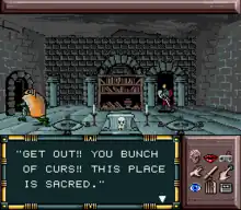 Drakkhen's gameplay is colored by its early-game brutality and surreal enemy encounters, the former especially in the SNES version. One special enemy is relegated solely to appearing when the player kicks one of the many urns in the ground. Upon doing so, a black, stationary canine head rises from beneath the floor to shoot bolts from its eyes. These encounters are quickly fatal to new players who don't know any better.[2] They offer no experience points, suggesting that kicking an urn is frowned upon. Another difficult enemy is the "Shadow Man", a tall figure that can unexpectedly lift itself out of the ground, accompanied by an ominous tune. Each enemy has movement and attack differences, some being less subtle than others, such as enemies that zigzag sporadically at a much greater speed than the player's party can keep up with. The game contains over one hundred different enemy variants.[3]
