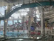 DreamWorks Water Park occupies six stories adjacent to Nickelodeon Universe American Dream.[22] According to the mall's organizers, DreamWorks Water Park is the largest indoor water park in the United States, at 8.5 acres (3.4 ha).[12][23][lower-alpha 1] Specific areas include an area themed around Shrek's Soggy Swamp, a Kung Fu Panda-themed children's play area called the Kung Fu Panda Zone, and a Madagascar-themed tower called Madagascar Rain Forest with 15 water slides.[12][25] All of the park's water slides were exclusively developed by ProSlide Technology, a Canadian company.[26][27][28] Inside is a 1.5-acre (0.61 ha), 1,500,000-U.S.-gallon (5,700,000 L) indoor wave pool and a lazy river which runs through Shrek-themed scenery.[12][25][4] DreamWorks Water Park also contains a set of dueling slides, the world's second-tallest body slides, starting from a height of 142 feet (43 m) and featuring a 50-foot (15 m) free fall.[4][26][27] Another attraction is a 1,600-foot-long (490 m) "hydro-magnetic roller coaster called Toothless Trickling Torpedo" and a Proslide KrakenRACER mat racer slide called Dragon Racers. Dragon Racers and Toothless Trickeling Torpedo are the only rides in the water park that are themed towards the How to Train Your Dragon franchise.[4][26][27][29]