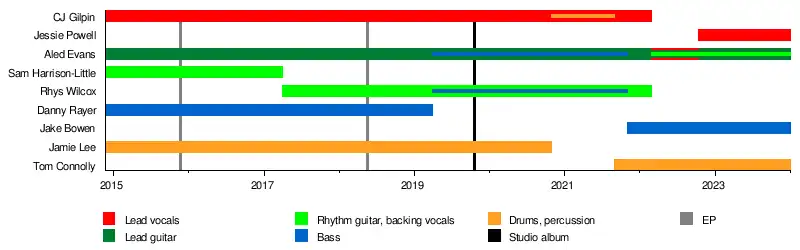 The band currently consists of guitarist Aled Evans, along with bassist Jake Bowen, drummer Tom Connolly and vocalist Jessie Powell.