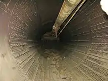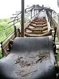 Gold was recovered in a rotating 49.5-foot (15.1 m) long trommel screen with 9.75-foot (2.97 m) diameter and 12.5% grade.[14] A pipe was suspended within the trommel, carrying water upwards to spray the incoming material, cleaning it and breaking up larger lumps.[15] Finer material (gold, sand, and pebbles) was sieved through 0.75-inch (1.9 cm) holes in the screen, which rotated at 7.8 revolutions per minute, into a distributor box.[15] From there, it flowed into sluice tables, long troughs with an area of 1,705 square feet (158.4 m2) which had a constant flow of water.[14][15] About 75% of the gold was caught in a 4-foot (1.2 m) coconut matting and steel riffles at the bottom of the troughs.[15] A smaller distributor captured another 20% of the gold, and all remaining material was washed out into the dredge pond.[15] The larger pieces of gravel were ejected from a 32-inch (81 cm) wide stacker at its rear, a 131-foot (40 m) belt moving at 356 feet per minute (1.81 m/s).[16] These tailings remain as a "vast, rippled blight on the landscape".[3] Particles of gold and nuggets too large to fit through the screen holes would be ejected with the gravel.[7]