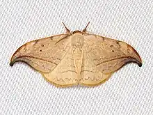 Drepana arcuata, the arched hooktip or masked birch caterpillar, is a moth of the family Drepanidae. The species was first described by Francis Walker in 1855.[1] It is found from Newfoundland to Vancouver Island, south to at least North Carolina, South Carolina and California.