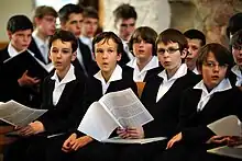 The Dresdner Kreuzchor is the boys' choir of the Kreuzkirche in Dresden, Germany. It has a seven-century history and a world-wide reputation. Today, the choir has about 150 members between the ages of 9 and 19, from Dresden and the surrounding region. The boys attend the Kreuzschule in Dresden. They are also called "Kruzianer".