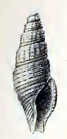 A little whitish species of oblong fusiform shape and of bold contour. It is very distinct in both sculpture and painting of the spiral straw-coloured lirae surrounding the 7 whorls, which are not costulate. One spiral lira, acute and prominent, is especially noticeable at the base of each whorl, just above the sutures. The aperture is ovate-oblong with a distinctive wide sinus. The siphonal canal is wide and very short.[2]