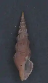 The elongated shell is turreted and has a fusiform shape. This species is of uniform reddish or purplish brown. The upper half of the whorls is concave and devoid of spiral lirations, which exist only on the lower portion. The shell contains 13 whorls, of which the first two are convex. The rest are concave and angulate in the middle. The axial ribs cross the almost obsolete lirations. The aperture is narrow and measures about 13 of the total length of the shell. The outer lip is thin and has a crenulated margin and is smooth on the inside. On top, just below the suture, it is sharply indented. The columella is almost straight and has a thin callus. The siphonal canal is very small and slightly curved.[1]