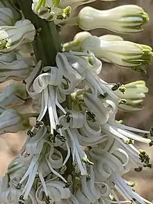 The flowers appear on a long, slender raceme, in November to March, after the leaves are already dry. The flowers are pale yellow-cream with green midribs. The seed capsules are trilocular.