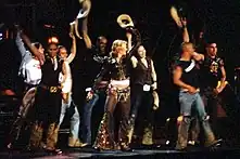 Designer Jean Paul Gaultier was signed up to create the costumes for the tour; his designs had a fusion of punk and Scottish fashions, geisha, cowboy and Spanish themes.[29][30][24] These included torn shirts and zippered black pants, a nod to Madonna's early days; black wigs and white makeup that referenced the geisha aesthetic used on "Nothing Really Matters" (1999); leather chaps over jeans like the ones she wore on her "Don't Tell Me" music video, and a "hybrid" of clothes from the "La Isla Bonita" music video and the 1996 musical Evita.[21] Brothers, Dean and Dan Caten, creators of the DSquared2 fashion line, contributed with ghetto fabulous costumes, which represented the phase of Madonna's career at that time.[21] Stylist Arianne Phillips, who had worked with Madonna on the past, oversaw the costumes, designing some and collaborating on others with Gaultier.[31] Three exact copies of the outfits Madonna wore in each segment were created, while only two copies were made for the dancers' clothes.[8] The poster and the logo for the tour were developed by Chase Design Group, who wanted to make the logo as aesthetic as possible. They developed a custom icon and type of logo to convey the "unique and ethereal qualities" of Madonna's show, which was described by the group's founder Margo Chase as "a multilayered musical and spiritual journey through diverse worlds". Chase commented that since "Madonna is a student of Kabbalah, she requested that we include references to that body of knowledge". The resulting logo and poster included both Arabic and Hebrew references. A number of designs were prepared by Chase and the one ultimately chosen by Madonna made it to the main poster of the show, which featured her face-shot from the "What It Feels Like for a Girl" video.[32]