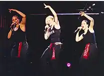 The tour took its name after J. G. Ballard's 1962 novel The Drowned World and Madonna's 1998 single of the same name.[19][20] Liz Rosenberg stated that it would be her "grandest spectacle to date".[21] In May 2001, AOL, the tour's main sponsor, offered its subscribers advance tickets to the US shows before they went on sale to the general public.[22] Like Madonna's previous tours, Drowned World was divided into different thematic acts: Rock 'n' Roll Punk Girl, Geisha Girl, Cyber Cowgirl, and Spanish Girl/Ghetto Girl; each of these segments represented a phase of Madonna's career.[23][21] The singer herself said that she envisioned the show as "a theatrical representation of my music [...] I have taken my inspiration from many things — martial arts, flamenco, country, punk, rock and roll, dance, and circus".[10][24] The set list consisted mainly of songs from Music and Ray of Light; among her pre-1990s singles, only "Holiday" (1983) and "La Isla Bonita" (1987) were included.[25][24] Entertainment Weekly reported that this was Madonna's choice, as she didn't want to do a "'Solid Gold' hit parade".[26] The tour's production manager Mark Spring said in an interview for The Independent that it was the "most complicated thing" he had ever done. He further elaborated: "The [Madonna] mystique figures very highly, so you have a whole other level of professionalism you have to attain. [It's] not that you wouldn't do your best, of course. But this is Madonna. Her show is perfect. There are no mistakes".[27]